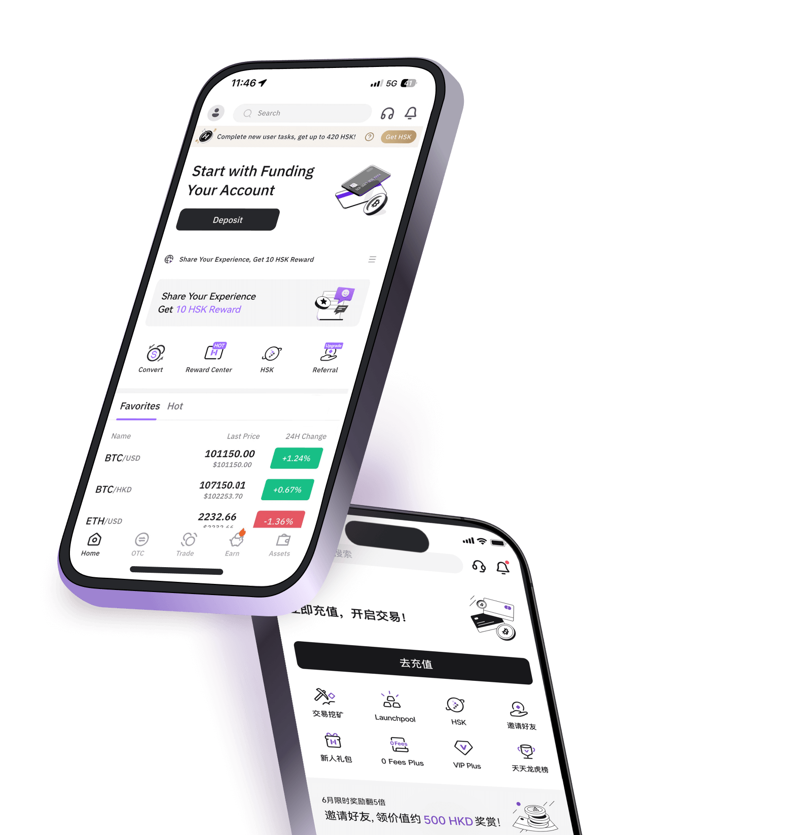 提供美元、港幣和數字資產交易對。